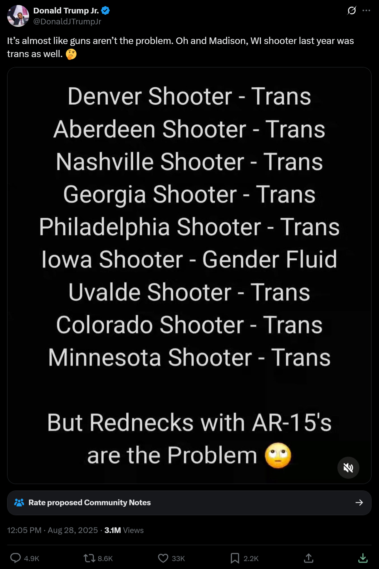 And again, the final list entry in Donald Trump Jr.’s post was the Minnesota shooter from this week, the shooter whom the various personalities are using the shooting to characterize “a trans pattern” in mass shootings.