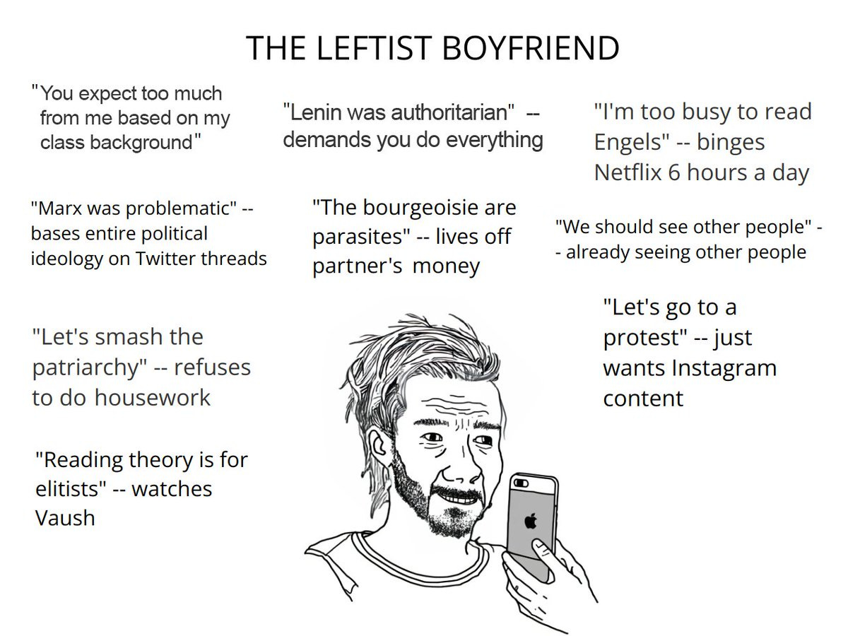 Today, the left enthusiastically continues to operate within the confines of bourgeois ideology. This is evident in its focus on identity politics and cultural issues, which divert attention from capitalism's defining contradiction (the socialization of production while retaining individual appropriation). The left protects the bourgeoisie from a unified class challenge by emphasizing lines not drawn based on where power comes from.